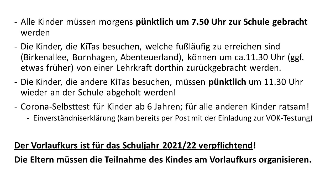 Bitte bringen Sie Ihr Kind an dem Termin pünktlich vor den Haupteingang der Schule. Für den Sprachtest mit Ihrem Kind planen wir ca. 20 Minuten ein. Sie können auf dem Schulgelände auf Ihr Kind warten.