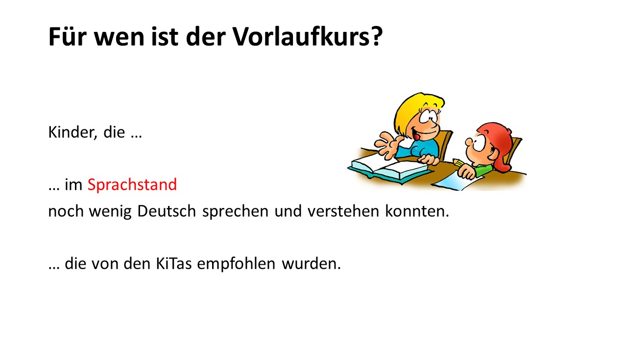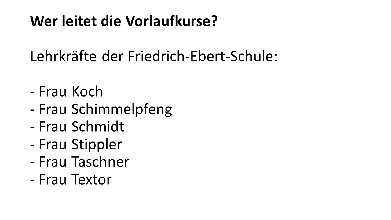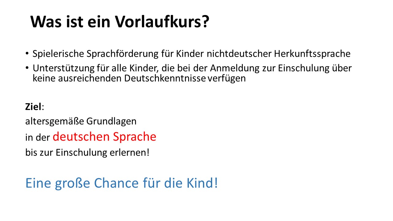 auf Grundlage des Sprachstandes oder der Empfehlung der KiTa soll Ihr Kind an den Vorlaufkursen der Friedrich-Ebert-Schule im Schuljahr 2022/2023 (Beginn im September/Oktober) teilnehmen. Angehende Schulkinder, die Deutsch als Zweitsprache gelernt haben, werden im Vorlaufkurs in ihrer Sprachentwicklung zusätzlich gefördert, um ihnen im Jahr 2023 einen guten Schulstart zu ermöglichen. Die Vorlaufkurse finden vormittags in den Räumen der Schule statt.
