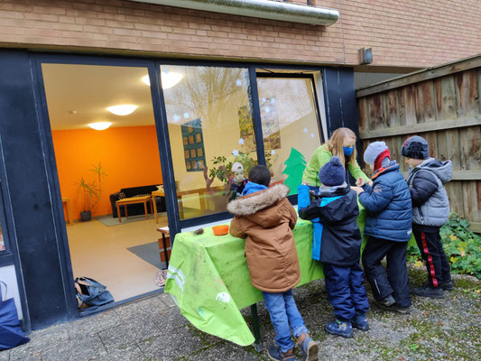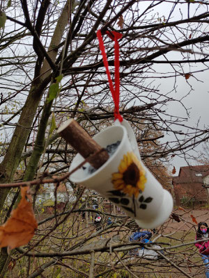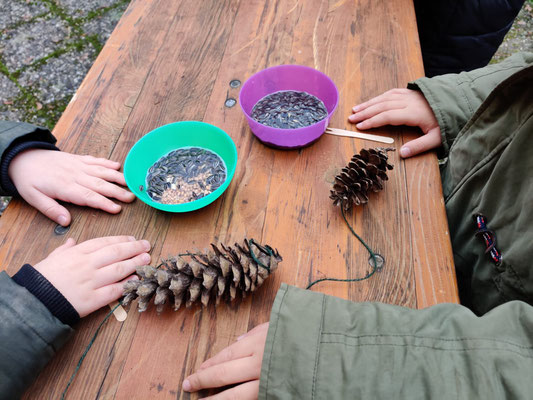 Kurz vor den Weihnachtsferien führten beide Vorklassen gemeinsam mit dem STZ Baunatal das Projekt zur Vogelfutterherstellung durch. Vor Eintreffen der Klassen hatte eine Mitarbeiterin des STZs bereits alle notwendigen Materialien auf Tischen im Außenbereich verteilt, sodass die Kinder nach kurzer Erklärung sofort loslegen konnten. Mit viel Freude und Fingerfertigkeit entstanden wunderschöne Futteranhänger, die anschließend auf der nahegelegenen Streuobstwiese an Bäumen und Sträuchern verteilt wurden. Zwischendurch gab es noch viel Wissenswertes über die heimische Vogelwelt und Artenvielfalt in einem Filmbeitrag von NABU zu sehen.