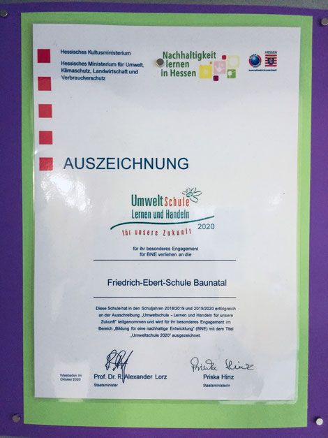 Im November 2020 ist die Friedrich-Ebert-Schule im Programm „Umweltschule – Lernen und Handeln für unsere Zukunft“ ausgezeichnet worden. Leider musste in diesem Jahr die geplante Auszeichnungsfeier mit Übergabe der Urkunden für alle Umweltschulen wegen der steigenden Corona-Fallzahlen abgesagt werden.